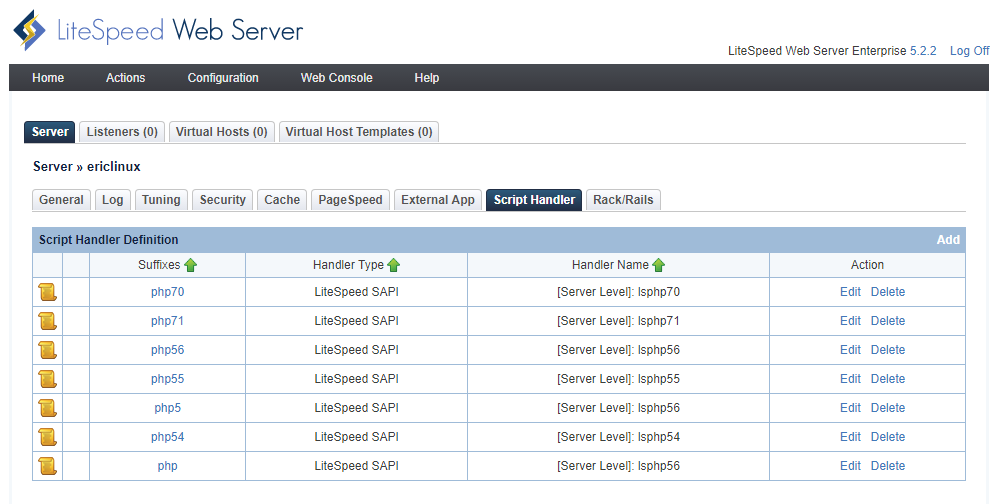However, there is an important change starting from LSWS 5.4: External apps and script handlers are not necessary unless you want to specifically define handlers. External apps may still exist/be inherited if you upgrade LSWS from an earlier version, but you may find the external app and script handler empty for new installations. For most common setups, this auto detection should work well. However, it is still possible to configure the PHP handler explicitly if you have a need to do so.