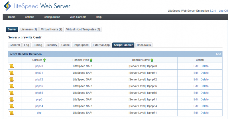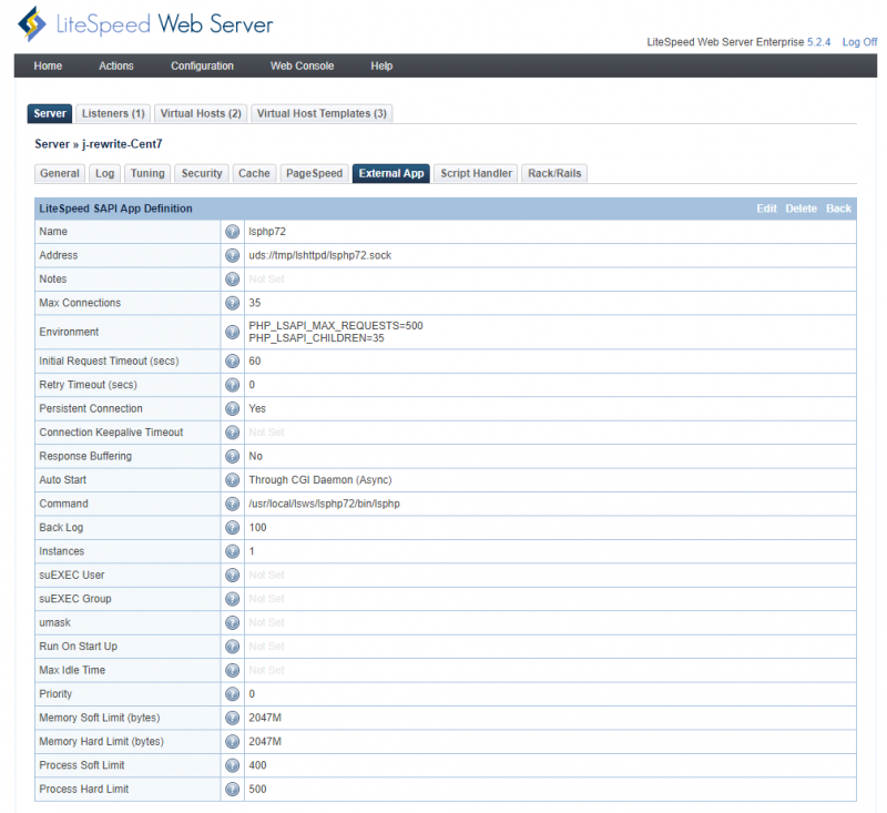 FastCGI: a FastCGI application with a Responder role. (Perl)FastCGI Authorizer: a FastCGI application with an Authorizer roleLiteSpeed SAPI App: an application that communicates with the web server using LSAPI protocol. (PHP, Ruby, and Python)Servlet Engine: a servlet engine with an AJPv13 connector, such as Tomcat. (Java)Web Server: a web server or application server that supports HTTP protocol.Piped Logger: an application that can process access log entries received on its STDIN stream.Load Balancer: a virtual application that can balance the load among worker applications.