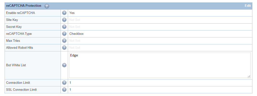Here, we have configured Edge in the Bot White List text area. Bot White List is a case-sensitive "contains" match, but regex may be used as well.