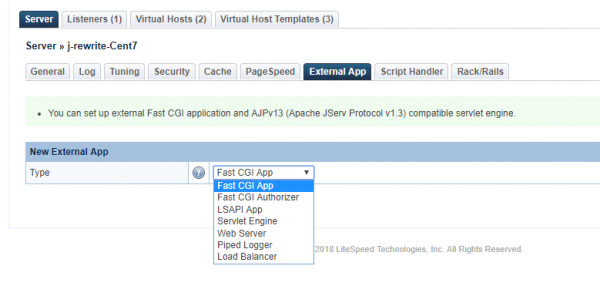 FastCGI: a FastCGI application with a Responder role. (Perl)FastCGI Authorizer: a FastCGI application with an Authorizer roleLiteSpeed SAPI App: an application that communicates with the web server using LSAPI protocol. (PHP, Ruby, and Python)Servlet Engine: a servlet engine with an AJPv13 connector, such as Tomcat. (Java)Web Server: a web server or application server that supports HTTP protocol.Piped Logger: an application that can process access log entries received on its STDIN stream.Load Balancer: a virtual application that can balance the load among worker applications.