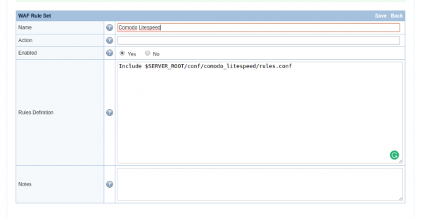 This will download Comodo LiteSpeed rules, and move rules.conf.main to rules.conf. This is the master file including all rules. You can reference this master file in the WebAdmin Console.