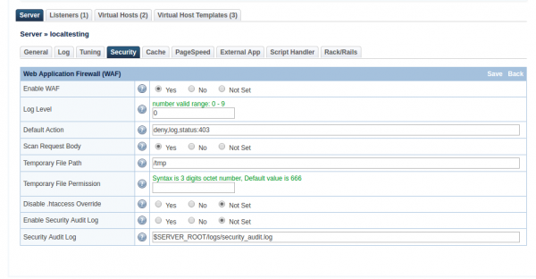 In the LSWS Web Admin console, there is a Web Application Firewall (WAF) section which allows you to enable ModSecurity and add a rule set on an LSWS native server. (For a control panel environment, these steps are unnecessary. Simply enable the ModSecurity rule set from the control panel, the same way you would enable a rule set for Apache.)