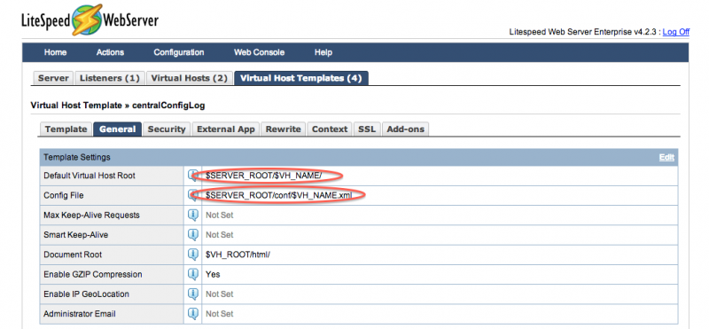 Most of the settings in a virtual host template are comparable to normal virtual host settings. However, if you look around the default templates, you will notice a special variable, $VH_NAME